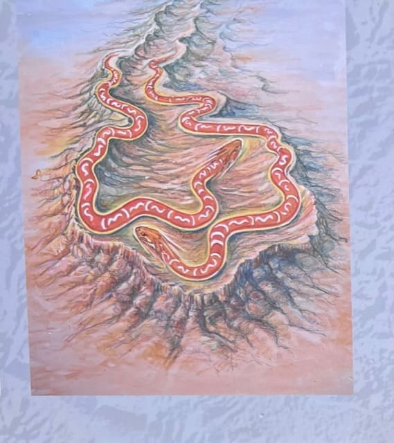 On the way down we could not find the path so we had to weave our way down the mountain. The next day we went on a walk to some Aboriginal rock art. The local Aboriginal tribes believed that Yurlu the king fisher left his home at karkarlpunha (Termination Hill) to attend a ceremony at Ikara. He lit fires to tell them he was coming. Forming coal desposits at leigh creek in the Flinders Ranges. At the same time that he left his home to Akurra left their home in Arrunha Akurra Awi and approached Ikara. The Akurra entered Ikara by Ediowi George. The following morning they cut steps in the hills on the north-western end of the range to see what was happening. People had gathered at Ikara for the ceremony. When they looked up they mistook the eyes of the Akurra for the stars. When the ceremony began the Akurra split up, planning to surround the people. One serpent Ngarnangarrinha went to the north-west and the other the south-east. They stirred up wirlwinds and in the confusion they ate all the people except wallha the wild bush turkey. He flew away and turned into a big rock and the two serpents bodies formed the Flinders Rangers Mountains.