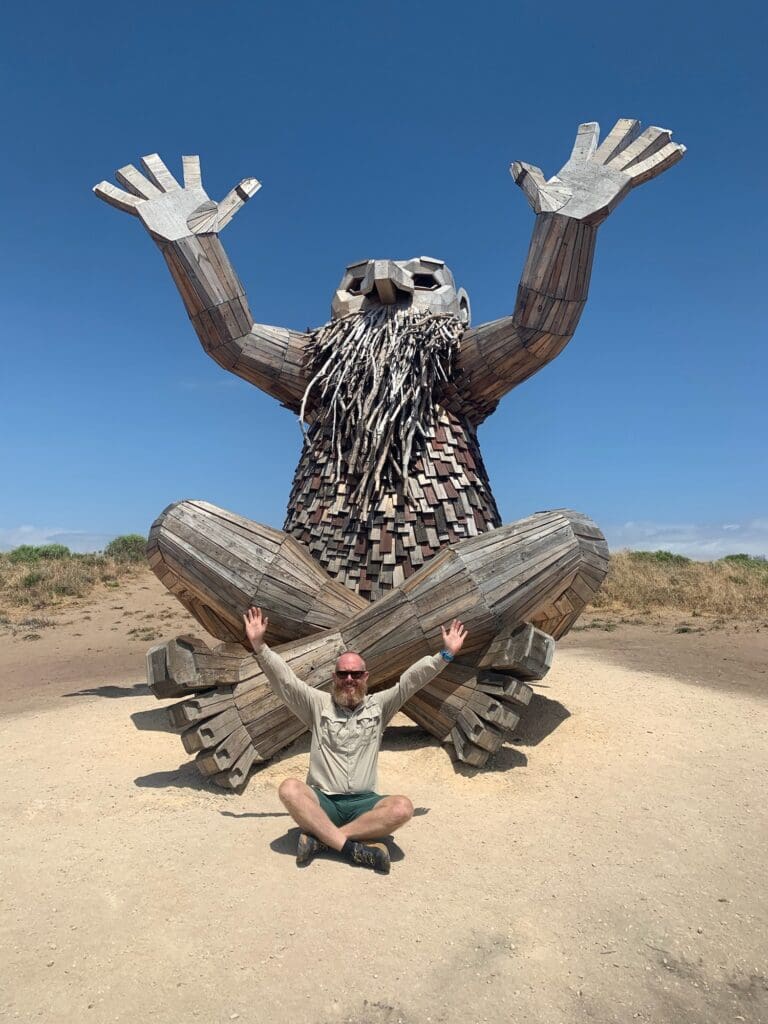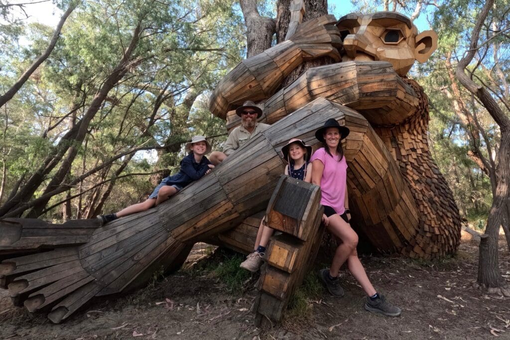 We first visited the information ceneter to get informtion on the giants. Then we went to Little Lui (the first giant). Little Lui was made from a tree stump that had been uprooted and turned on it’s side. They use the roots as Little Lui’s back and hair. The Mandurah giants are only in Mandurah for a set time before moving on. They are made by Thomas Dambo. The next giant was called Santi ikto. It was located on a sand dune facing out towards the beach with his hands in the air. Dad had a photo with his hands in the air to copy the pose Santi was in. After Santi Ikto, we went to look at the next giant called Seba. Seba was facing out to the water so you could not see him very well. We still got an amazing look at him. Seba reminded me of the BFG with his horn, but was missing the suitcase of dreams. Next we went to Yaburgurt Winjan Cirkelstone. He was lying on the ground with rocks near him. It was connected to an Aboriginal story about an elder who ate too many crabs. The last giant we visited was the hidden giant. The lost giant was sitting on the ground hugging a tree. He was my favourite giant out of all of them because he looked so cute.